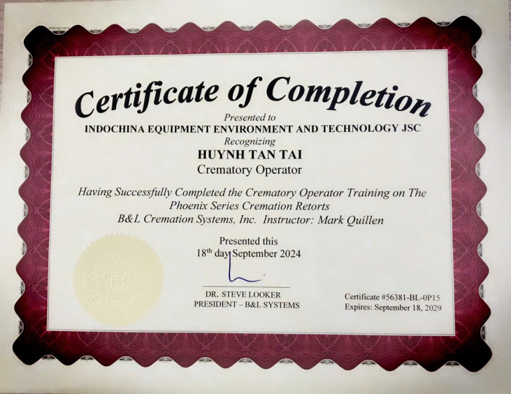 Công ty CP Đông Dương xin gửi lời cảm ơn chân thành đến 𝐌𝐫. 𝐌𝐚𝐫𝐤 𝐐𝐮𝐢𝐥𝐥𝐞𝐧 đã nhiệt tình hướng dẫn trực tiếp cho chúng tôi, trong suốt quá trình vận hành máy tại Việt Nam. Và vinh hạnh hơn nữa là được nhà sản xuất 𝐥𝐨̀ 𝐡𝐨̉𝐚 𝐭𝐚́𝐧𝐠 𝐁&𝐋 cấp giấy chứng nhận cho đội ngũ kỹ thuật của chúng tôi, đã hoàn thành xuất sắc khóa đào tạo vận hành lò hỏa táng dòng Phoenix. Đây là dòng sản phẩm hiện đại và tiên tiến nhất của thương hiệu B&L, mang đến những công nghệ đột phá giúp nâng cao hiệu quả và tính bền vững trong hoạt động hỏa táng.